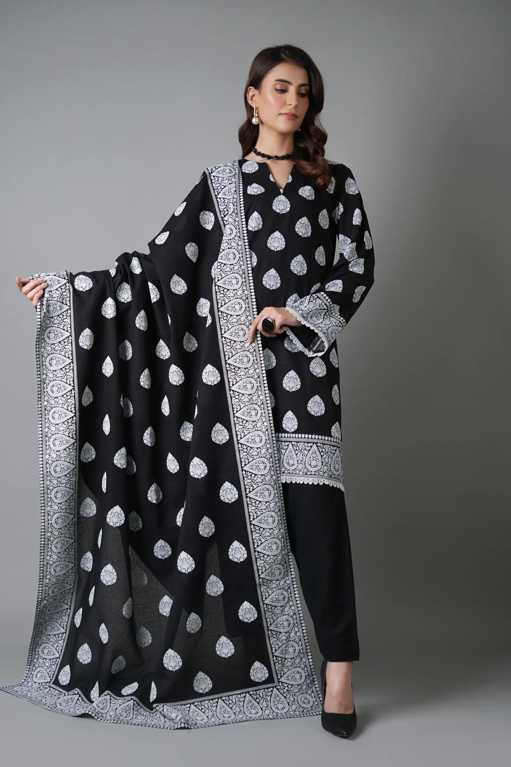 Shirt: Digital Print Shirt Digital Print Sleeves Fabric : Karandi —————————————————— Dupatta: Digital Print Dupatta Fabric : Karandi —————————————————— Trouser: Digital Print Trouser Fabric : Karand