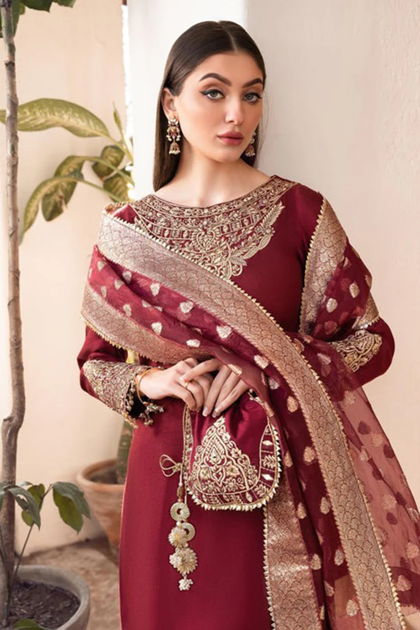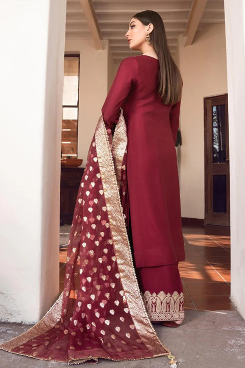 Be the first to review “KN882- 3PC Shamoz Silk Frock Style Embroidered Suit”